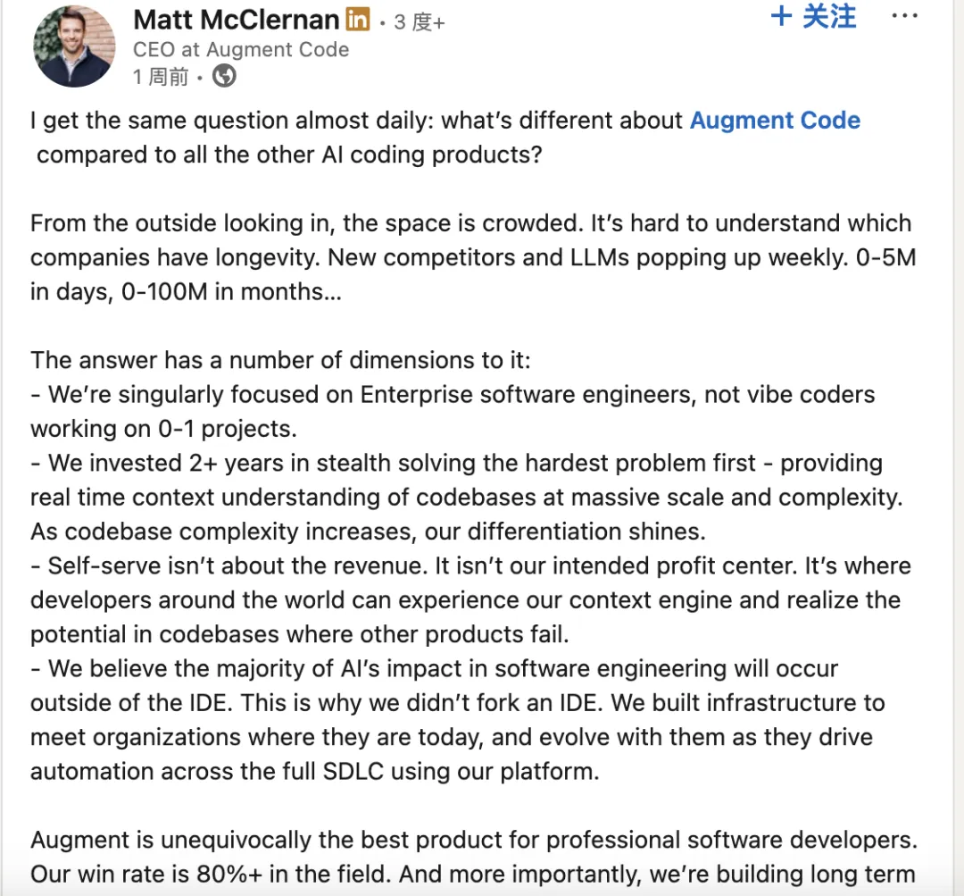 在确定定价变更的几天后,McClernan 在领英上发帖称,这个领域竞争非常激烈,但 Augment 在市场中的赢单率超过 80%。