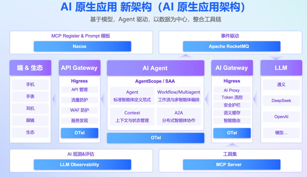 * **AI网关**:作为统一入口,提供多模型代理、回退、认证、安全防护、Token限流、语义缓存、可观测性及工具智能路由等功能。