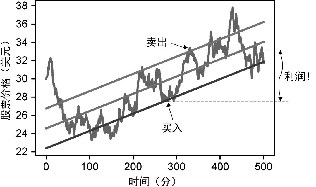 有了对股票价格走势的数学理解,我们就可以编写代码,在股票价格相对于其趋势开始低位波动时自动买入,并在价格回升时自动卖出。具体来说,我们的程序可以通过网络连接到证券交易所,在价格低于底线时买入100股,并在价格越过顶线时卖出100股。图1-3展示了一次这样的盈利交易:以27.80美元左右的价格买入,以32.60美元左右的价格卖出,在一小时内可以赚到约480美元。