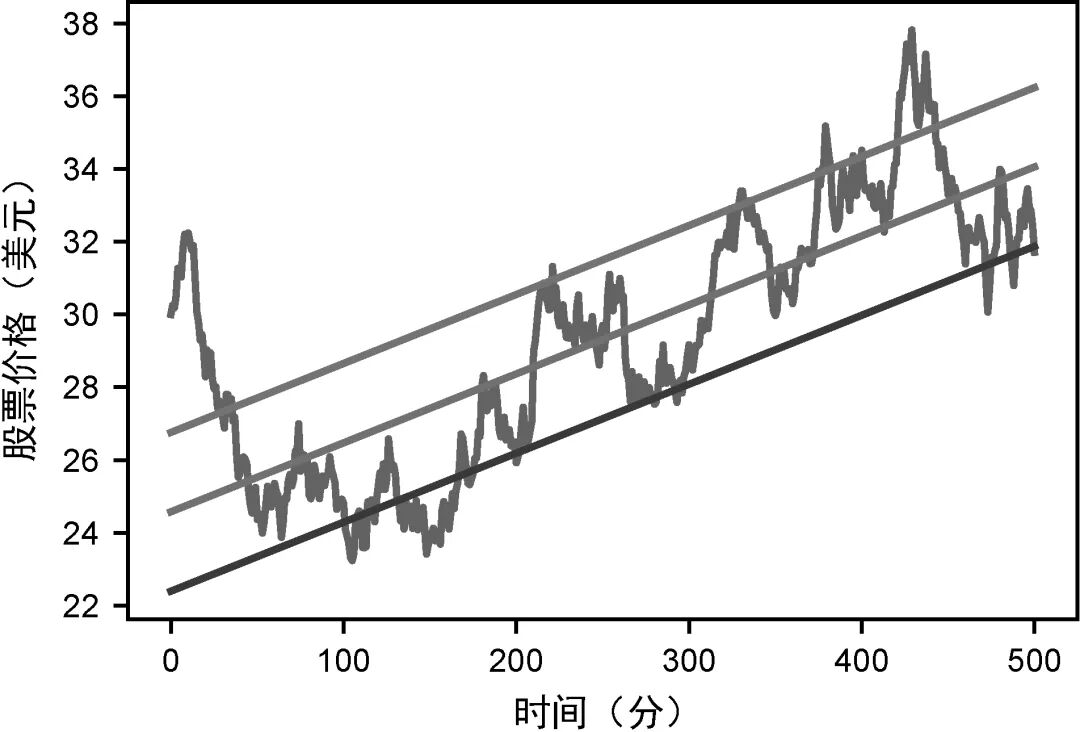 我们可以通过找到一条“最佳拟合”线来衡量股票价格会涨还是会跌,这条线大致遵循价格的变动方向。这个过程称为线性回归,本书的第三部分会介绍。因为数据是不断变化的,所以可以在“最佳拟合”线上下再计算出两条线,以显示价格上下浮动的区域。把它们叠加在价格图表上,可以看出这些线和趋势相符,如图1-2所示。