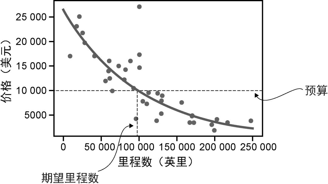 次幂。将这些数值代入方程,我们发现,如果预算是10 000美元,那么应该购买一辆行驶里程约为97 000英里的普锐斯(见图1-6)。如果曲线表示的是合理的价格,那么低于该线的汽车通常应该是划算的。