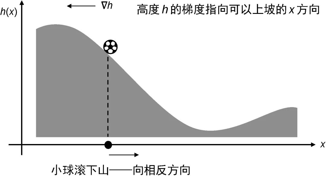 负梯度在物理定律中很常见。可以这样理解,自然界倾向于向低势能状态变化。一个球在山丘上的势能取决于山丘在任何横向点
