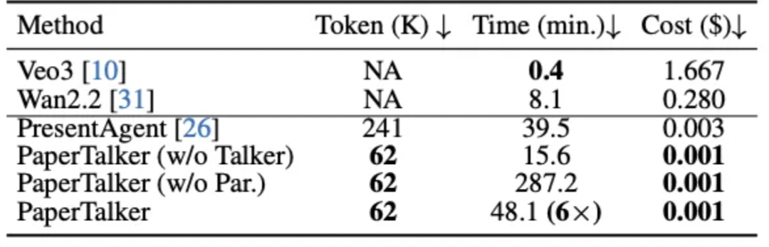 实验结果表明,PaperTalker在Paper2Video基准的四项评价指标上均取得最佳表现,其生成的视频在观感、知识传递和学术记忆度方面接近人工制作水平。在效率方面,PaperTalker也展现出最低的生成成本和显著的速度优势。这项工作为AI4Research领域的发展、促进科研交流的自动化与规模化迈出了重要一步。