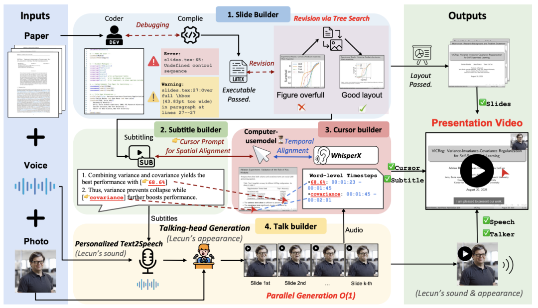 在此基础上,研究团队提出了 PaperTalker多智能体框架。该框架旨在实现学术展示视频的自动化生成,能够将研究论文、讲者图像和语音样本作为输入,自动输出包含幻灯片、字幕、语音、光标轨迹和讲者视频的完整内容。PaperTalker由Slide Builder(优化幻灯片布局,引入Tree Search Visual Choice提升效率)、Subtitle Builder(生成逐句字幕和视觉焦点提示)、Cursor Builder(通过UI-Grounding和WhisperX实现光标的时空精确对齐)和Talker Builder(合成身份一致、唇形同步的个性化讲者视频,并支持逐页并行生成以大幅提升效率)四个核心模块组成。
