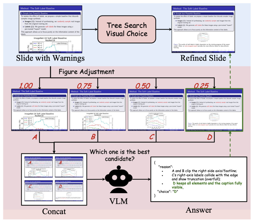 Slide Builder:基于论文内容生成 LaTeX Beamer 幻灯片,并引入 Tree Search Visual Choice 模块克服大语言模型在细粒度数值调整上的局限,从而优化版面布局,确保幻灯片布局合理设计。