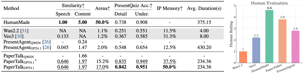 人类评价结果显示,人类录制视频得分最高,PaperTalker 次之,且显著优于其他方法,接近人类水平。