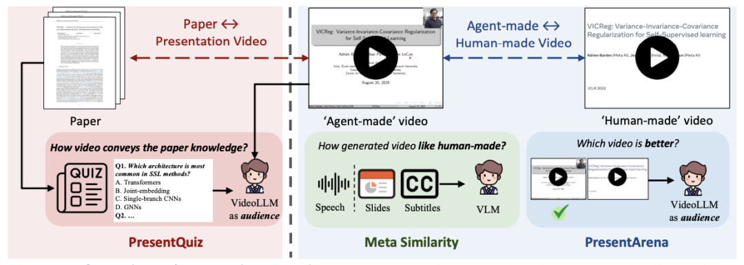 PresentQuiz — 信息传递性:通过基于论文构造选择题,使用 VideoLLM 作为代理观众进行问答,测试生成视频能否覆盖并有效传递论文中的关键信息。