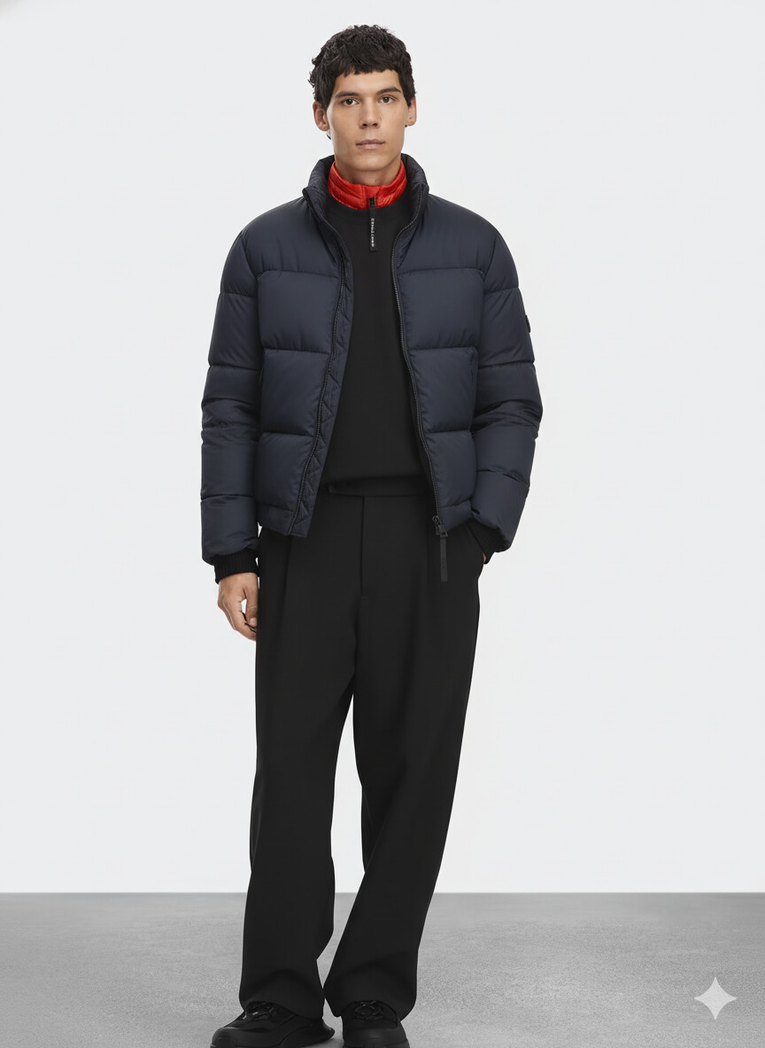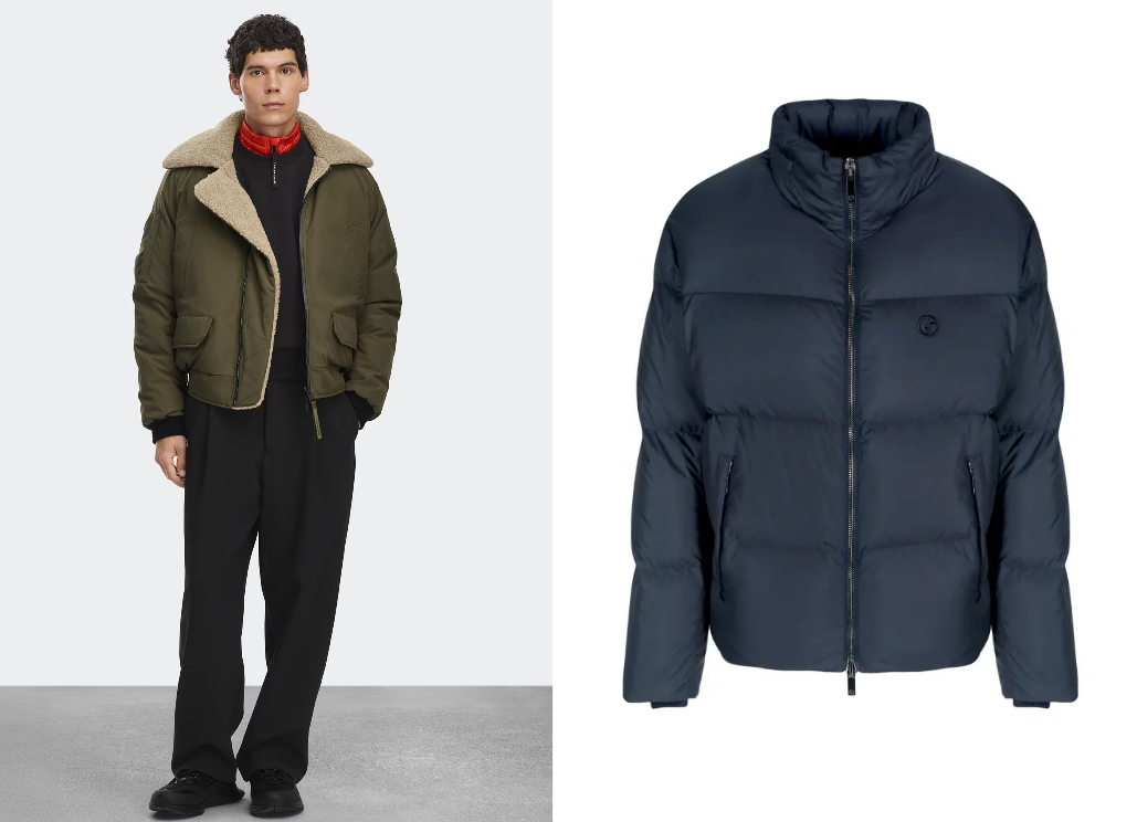 输入如下两张图,提示为「将第一幅图中的夹克替换为第二幅图中的衣服(Replace the jacket in the first image with the clothes in the second image)」。