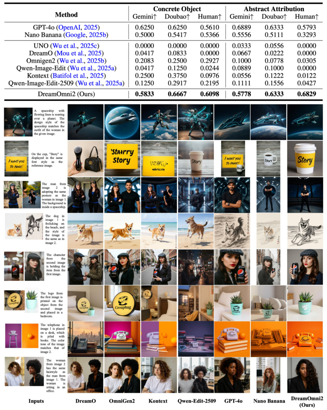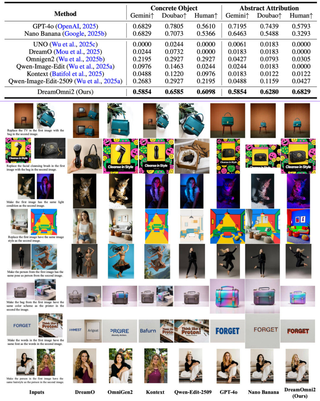 为解决这些痛点,港科大讲座教授贾佳亚团队开源了最新成果DreamOmni2。该系统基于FLUX-Kontext训练,在保留原有指令编辑与文生图能力的基础上,拓展了多参考图生成编辑能力。团队表示,DreamOmni2在处理具体物体和抽象概念的编辑与生成任务中,表现显著优于当前SOTA开源模型,在某些方面甚至比谷歌的Nano Banana效果更好。