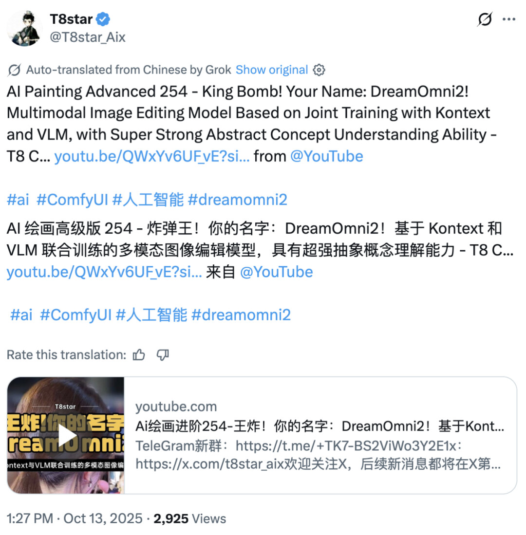 DreamOmni2 引起了海外创作者的关注与热议。有人给予了高度评价,认为它将颠覆人们对图像生成与编辑的认知;还有人给它冠上了「King Bomb」的称号,并特别称赞了其抽象概念理解能力。Youtube 还出现了大量的介绍以及使用经验分享视频。