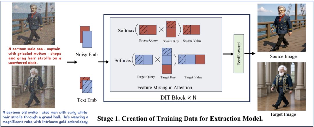 第一阶段采用特征混合方案,通过双分支结构同时生成源图像与目标图像。并且利用基础模型的 T2I(文本到图像)能力,创建包含具体物体与抽象属性的高质量数据对。与 UNO 采用的 diptych 数据生成方法相比,特征混合方案表现出了三大优势:不降图像分辨率、不会出现因分割线偏移而导致的内容混叠、数据质量与准确性更高。