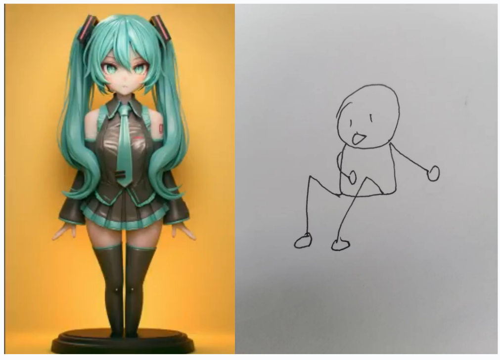 我们又测试了一个更具挑战性的任务,根据手绘草图,让模型生成一张姿态相同的图片。这类任务考验的不只是模型的图像生成能力,更是对动作识别、空间理解与语义映射的综合考验。
