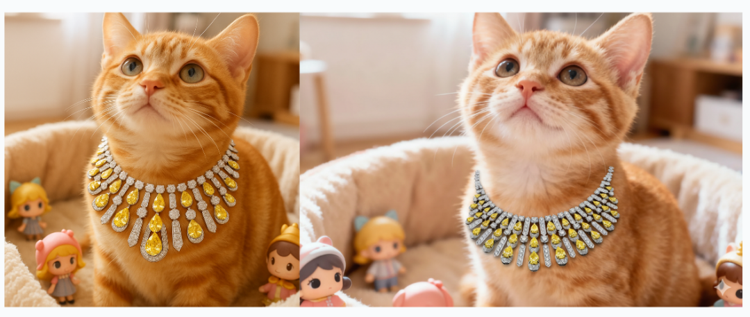 最后,我们同样对 DreamOmni2 与 GPT-4o、Nano Banana 的生成效果进行对比。输入两张图片,要求是「将图 2 的项链戴在图 1 中的猫的脖子上」。
