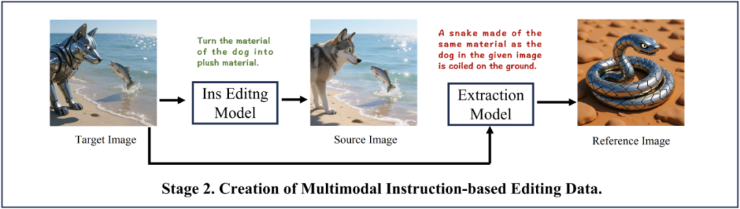 第二阶段聚焦于构建基于指令的多模态编辑数据。首先利用 T2I 模型生成的图像和真实图像来创建目标图像;随后利用第一阶段训练得到的特征提取模型来模拟目标图像中的物体或属性,并基于指令生成参考图像;接着使用基于指令的编辑模型修改目标图像中提取的物体或属性,从而创建源图像;最终形成了从参考图像、源图像到目标图像的训练对。