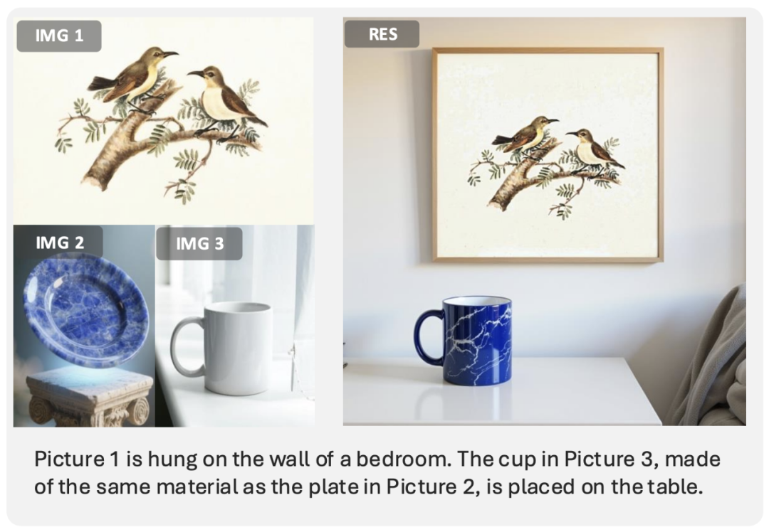 基于指令的图像生成:图 1 被挂在卧室的墙上,图 3 中的杯子变成与图 2 中盘子相同的材质,并被放置在桌子上。