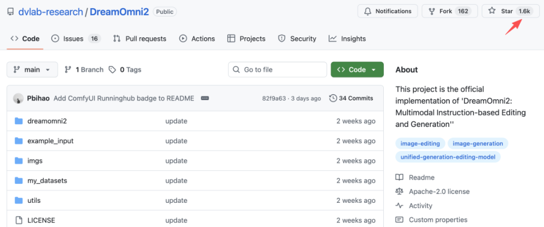 开源两周以来,DreamOmni2 收获了开源社区的大量认可,在 GitHub 上已经积累了 1.6k 的 Star 量。