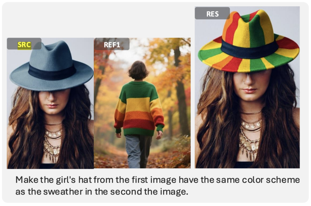基于指令的多模态编辑:让第一张图像(源图像)中女子的帽子拥有与第二张图像(参考图像)中毛衣相同的配色方案。