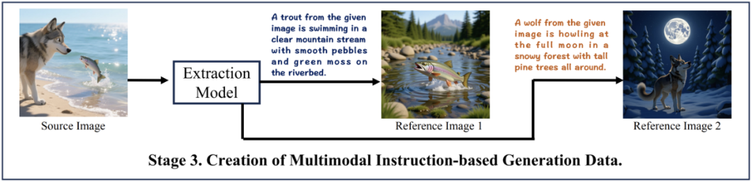 到了第三阶段,则要构建基于指令的多模态生成数据。首先利用第二阶段中训练的特征提取模型,从源图像中提取物体,创建新的参考图像;随后将这些参考图像与第二阶段已有的参考图像结合起来,最终形成由多张参考图像、指令和目标图像组成的训练数据集。