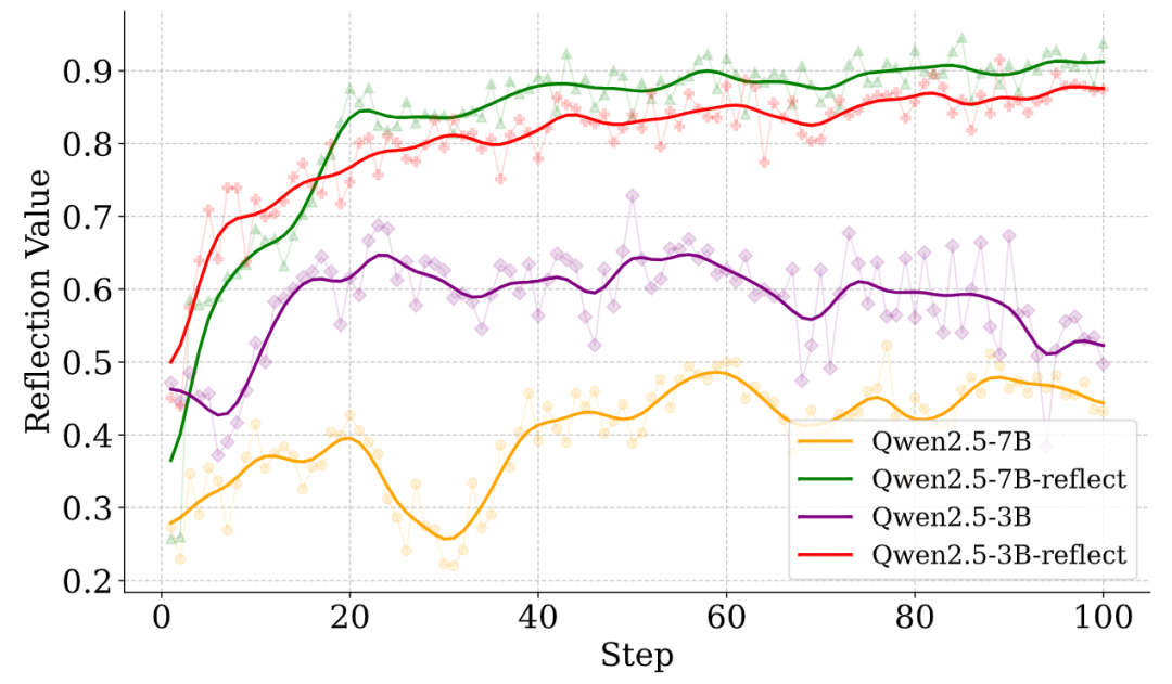 实验还证明了「反思奖励」的有效性。如果没有这个奖励,模型在反思时的判断准确率仅在 50% 左右(相当于随机猜测)。而加入奖励后,模型的反思能力得到了显著且稳定的提升。