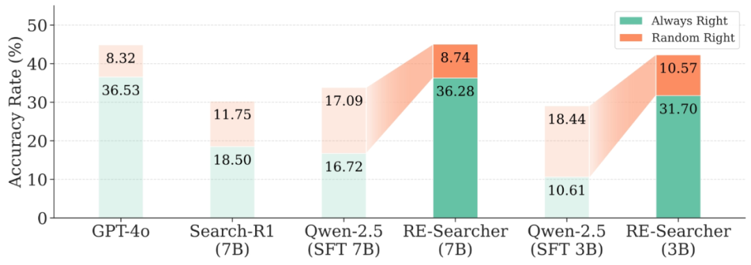 RE-Searcher 能否缓解前面提到的「随机正确」问题?答案是肯定的。