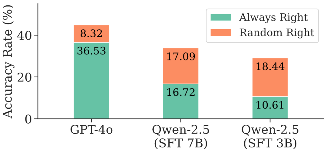 如图 1 所示,在相同数据上重复两次推理,弱一些的基础模型往往出现「随机正确」(random right)比例接近或甚至高于「总是正确」(always right)的情况。这种随机性极大削弱了模型的实际表现。这种不稳定的根源在于搜索过程的脆弱性。
