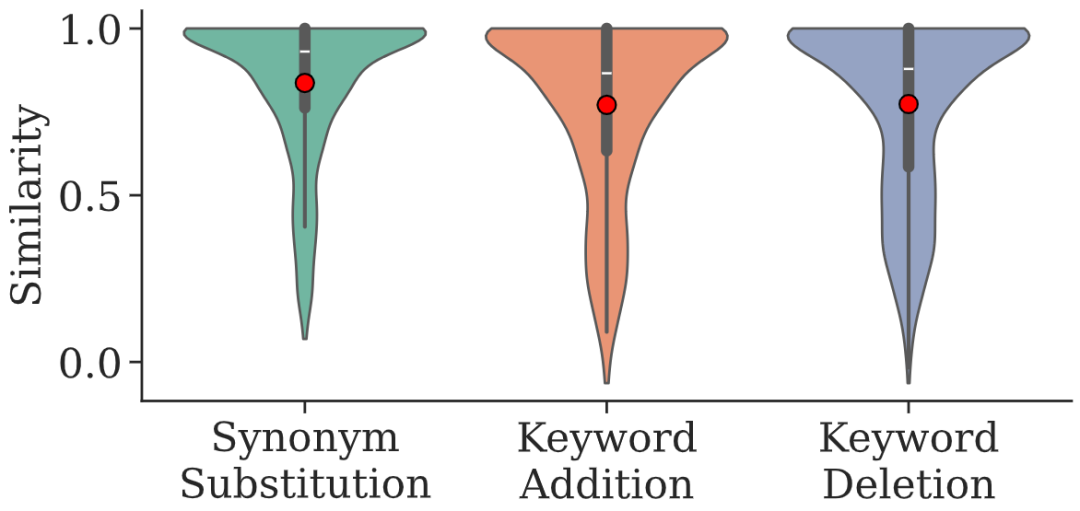 如图 2 所示,只对检索式做细微改动(同义替换、增/删一词),检索结果的语义相似度就可能大幅下降,许多样本跌破 0.6 阈值。一个看似合理却偏离主题的关键词,足以把搜索引向错误分支。
