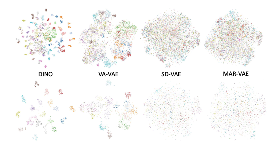 该论文同样对传统 VAE + Diffusion 的局限性进行了分析,发现其关键问题在于 VAE 空间存在非常明显的语义纠缠现象。VAE 的 latent 空间缺乏清晰语义结构,不同类别特征高度混合(论文通过 t-SNE 可视化验证,普通 VAE latent 中不同语义类别的特征点严重重叠),导致扩散模型需花费大量步数学习数据分布。