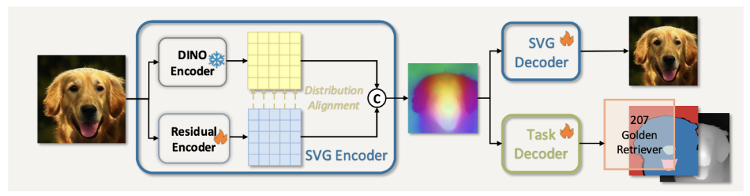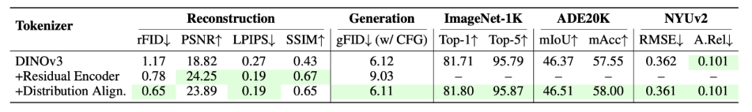 3. **分布对齐机制**:为防止残差特征破坏DINO的语义结构,该机制将残差输出进行归一化,并与DINO特征的均值方差对齐,确保拼接后的latent空间既保持高保真重建能力,又利于生成模型训练。