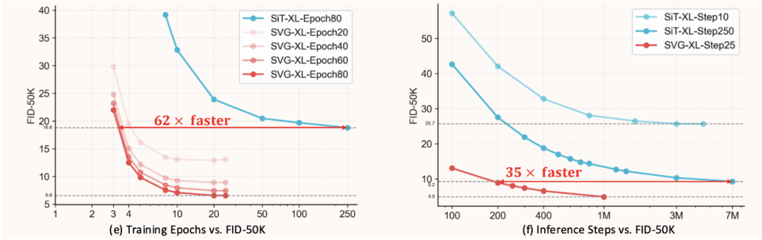 训练效率: 在 w/o CFG 设定下,SVG-XL 仅需 80 个 epoch 即可达到 SiT-XL 1400 个 epoch 的生成质量(gFID 6.57 vs 9.35);