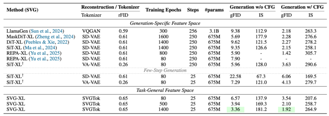 在训练 80 个 epoch,25 步采样条件下,SVG-XL(675M 参数)的生成性能全面超越同规模基线: