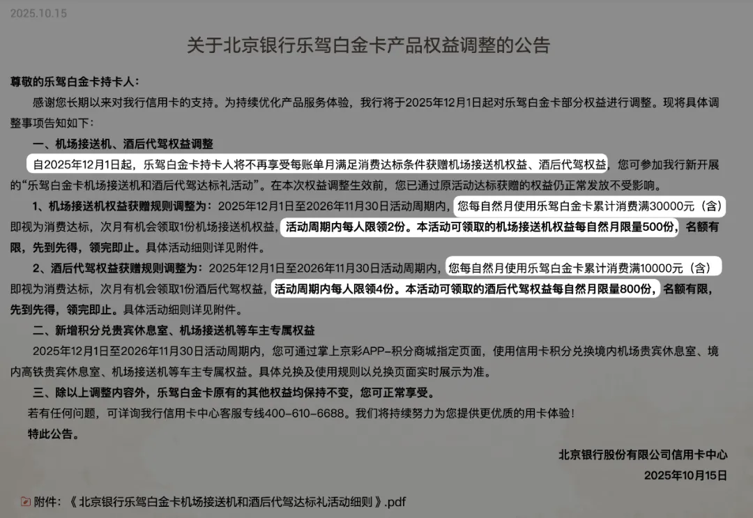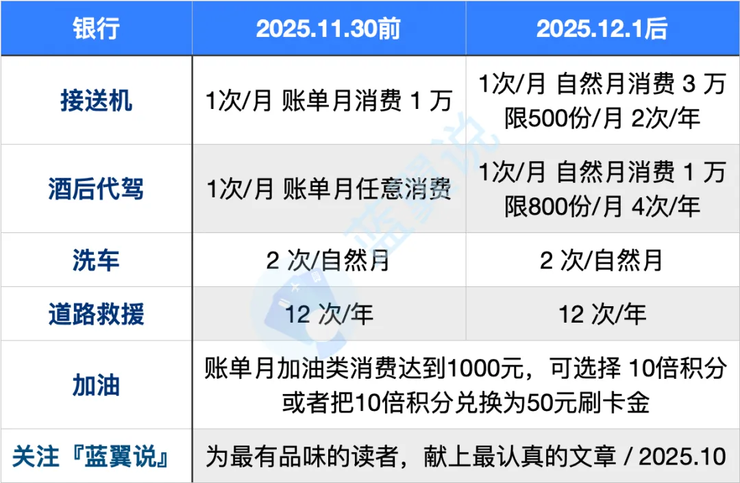 简单来说,机场接送机和酒后代驾权益都被大幅削弱:原本机场接送一个账单月只用消费 1 万元,现在飙升到每自然月 3 万元,而且一年只能领 2 次权益,更悲催的是每月限 500 份权益,不仅年度可用上限降到 2 次,当你真需要用的时候还不一定抢得到;而酒后代驾则是从上个账单月有任意一笔消费即可,提高到每自然月 1 万元……而且也加了份数限制,每月限 800 份,每年 4 次,真是令人惋惜啊。
