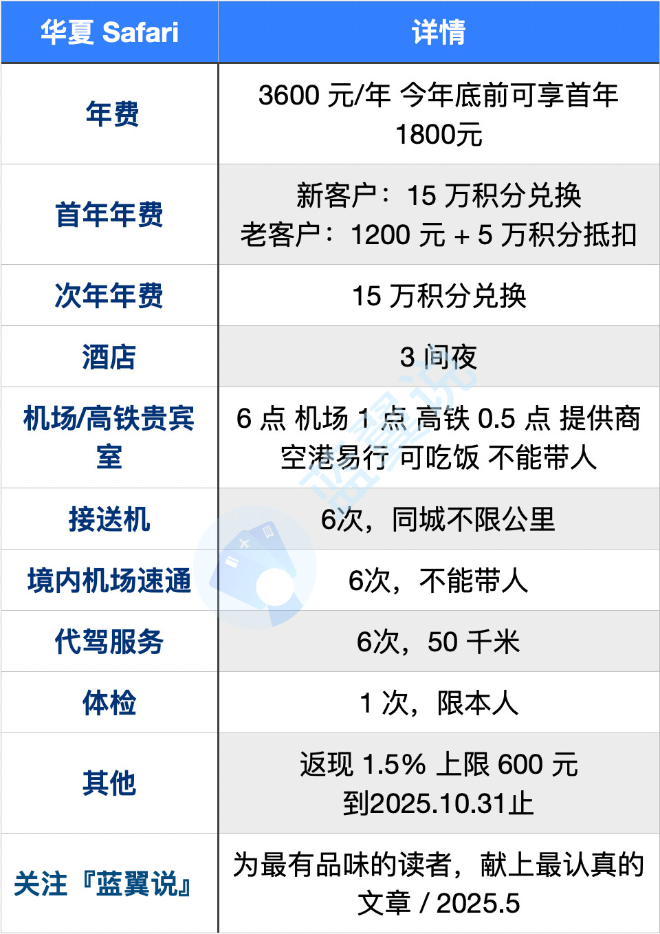而华夏 Safari 卡则是一张全面的卡,接送机/代驾/贵宾室应有尽有,蓝翼看着很眼馋,但是老用户和狗不得办理……
