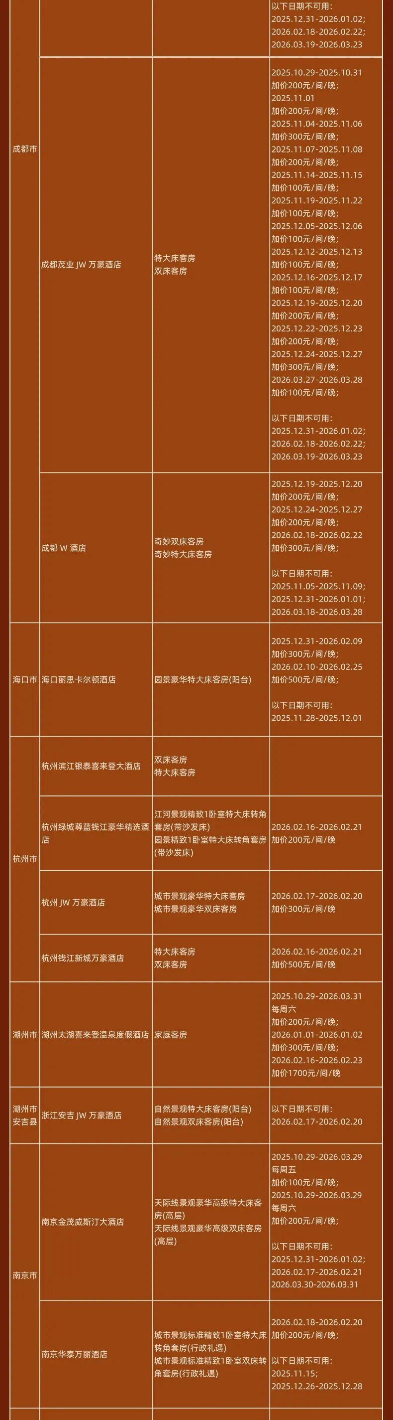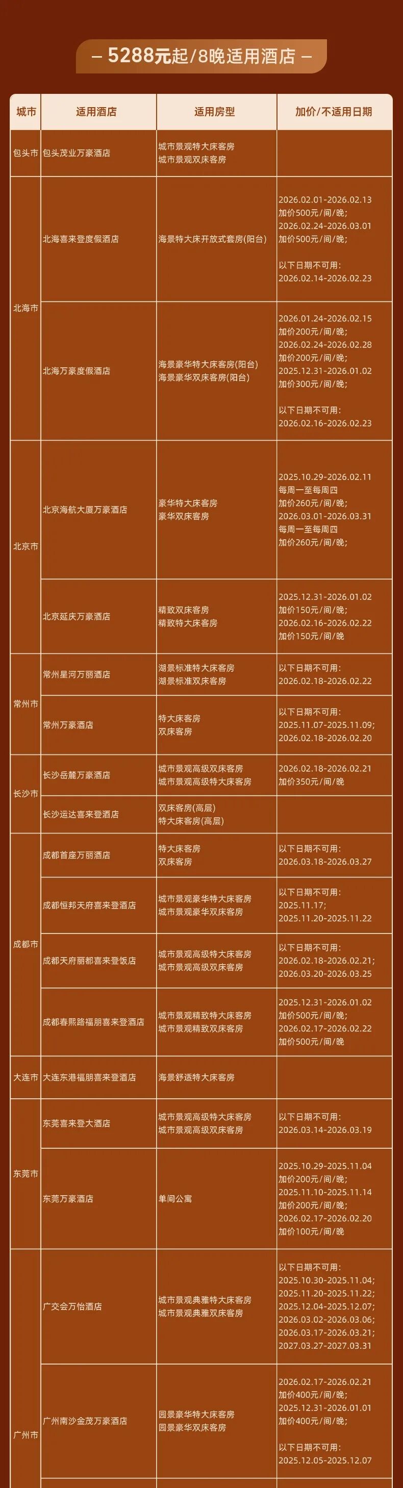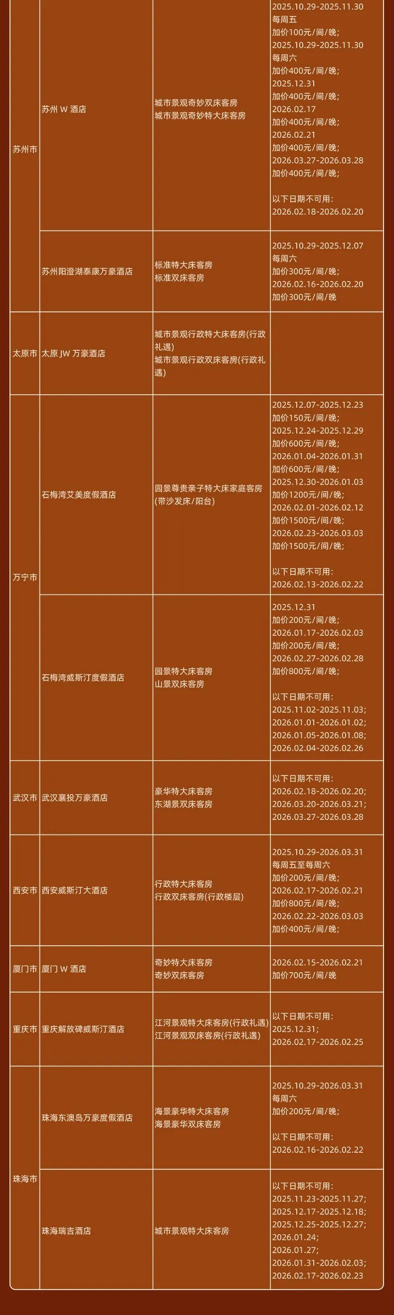 海口丽思卡尔顿、三亚亚龙湾瑞吉、亚龙湾万豪、石梅湾艾美、石梅湾威斯汀、珠海瑞吉、珠海东澳岛万豪、苏州W、成都瑞吉、成都W、厦门W、北京JW万豪(春节)、杭州JW万豪、重庆解放碑威斯汀、西安威斯汀、