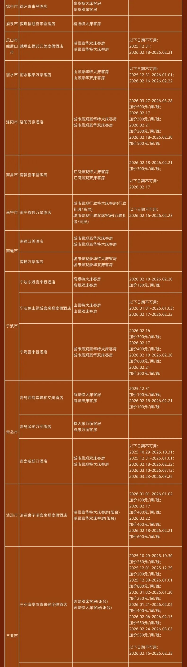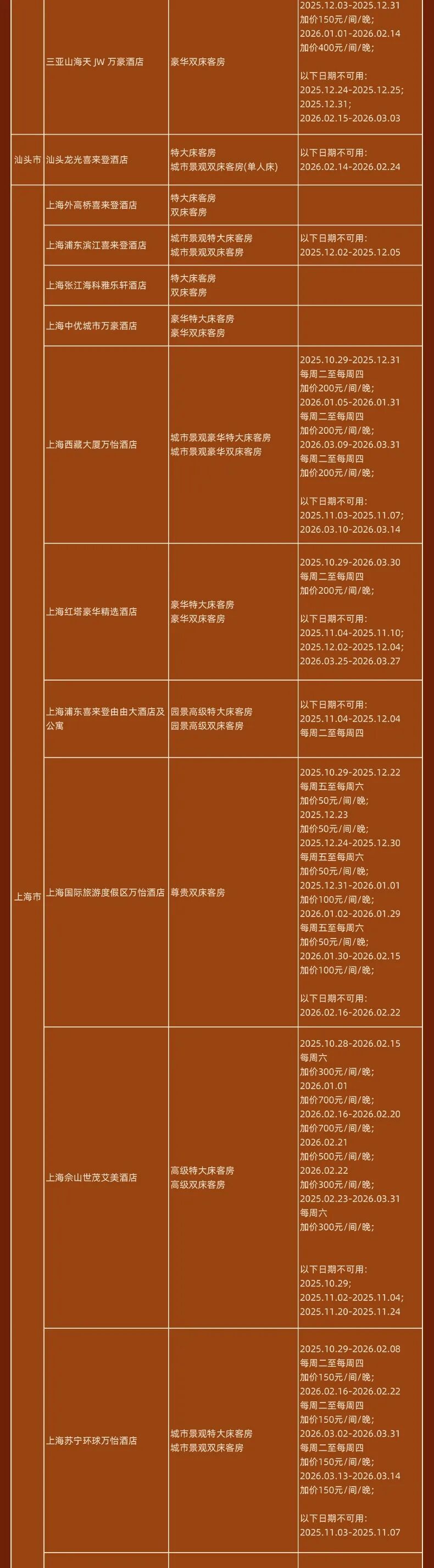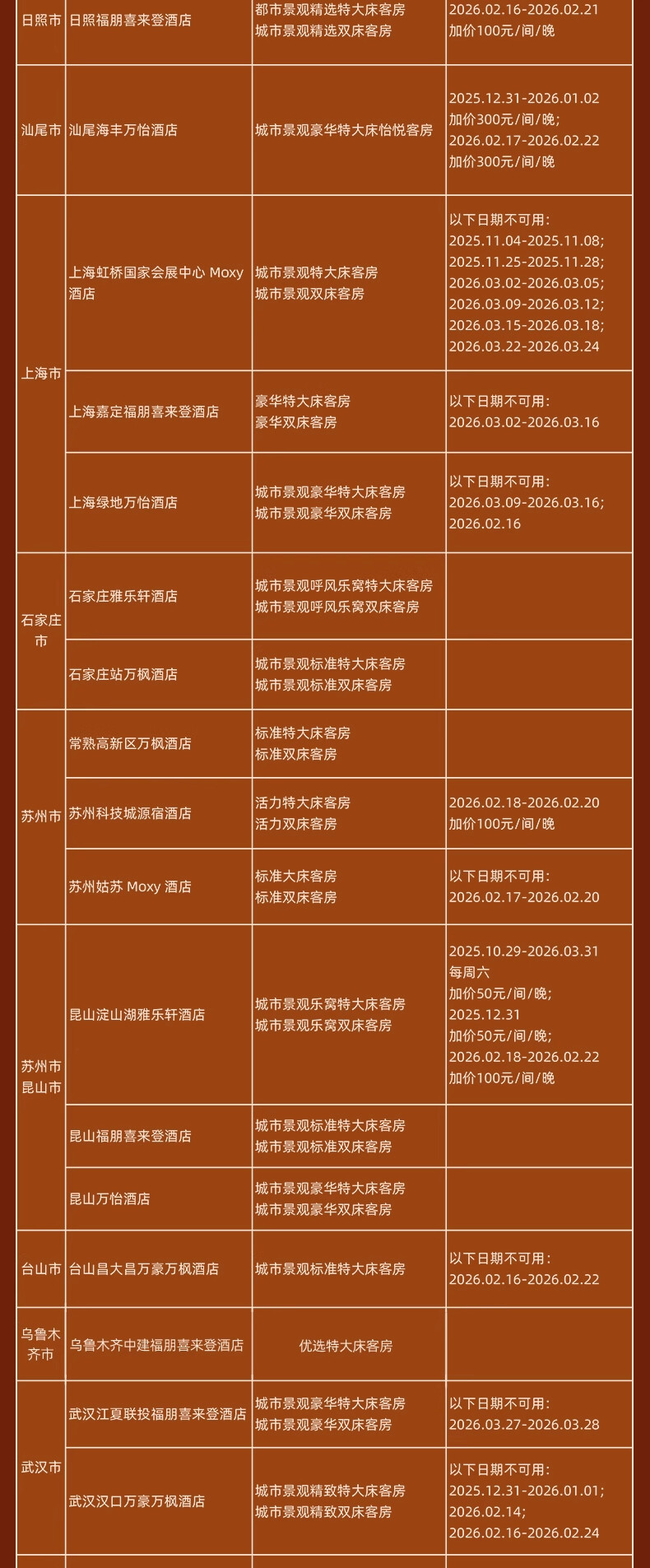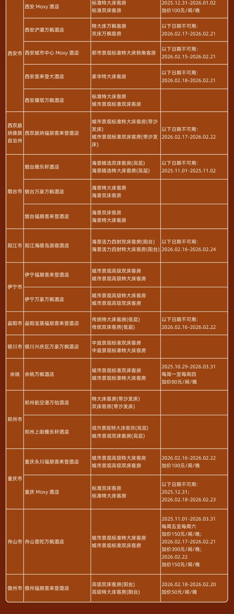 神州半岛福朋喜来登、九寨沟德尔塔(春节)、安顺黄果树福朋喜来登(额外2000分)、北京海淀雅乐轩(春节)、苏州太湖万豪、海口万豪、揭阳万豪、秦皇岛万豪、福州东湖万豪、开封大宏喜来登、西双版纳云投喜来登、昆明喜来登、青岛西海岸喜来登(春节)、兰州喜来登(春节)、上海嘉定喜来登(春节)、烟台金沙滩喜来登、日照喜来登、中式利和威斯汀、武汉汉阳威斯汀、洛阳万怡、三亚海棠湾万丽、重庆福朋喜来登、鹤山方圆福朋喜来登、上海普通Moxy(春节) 等