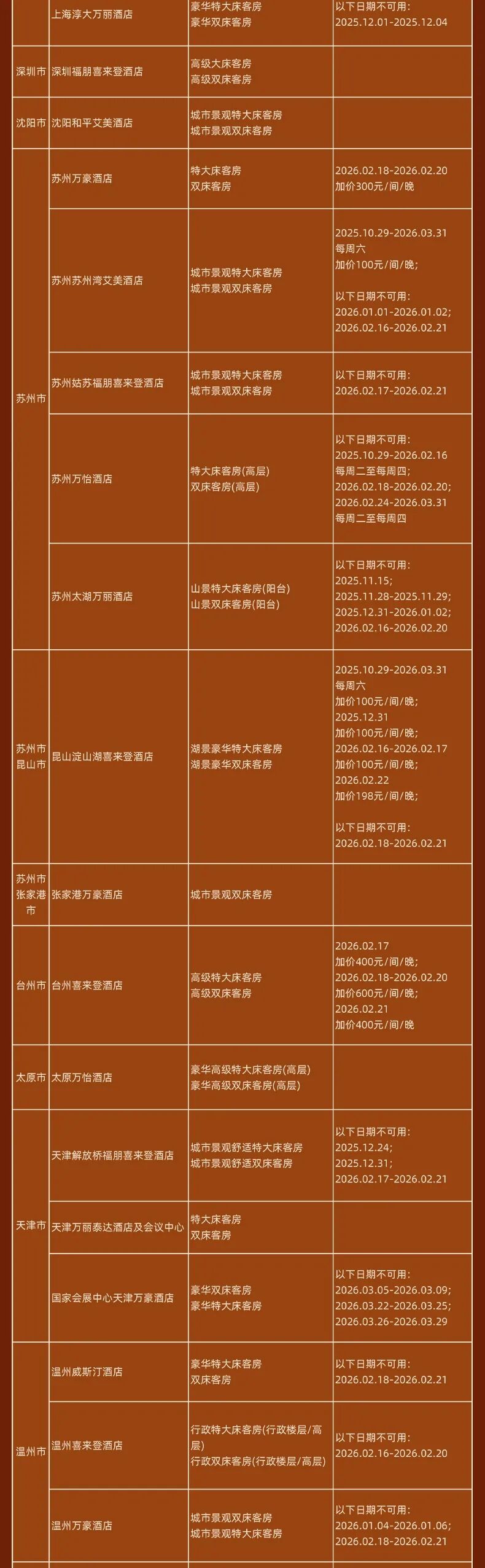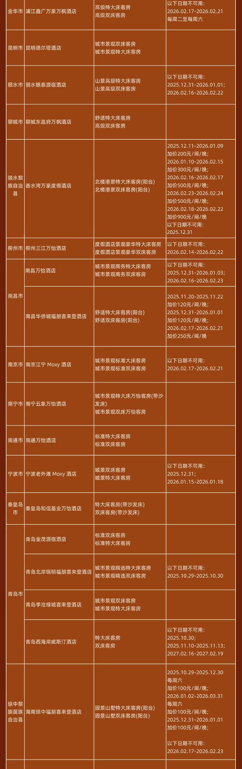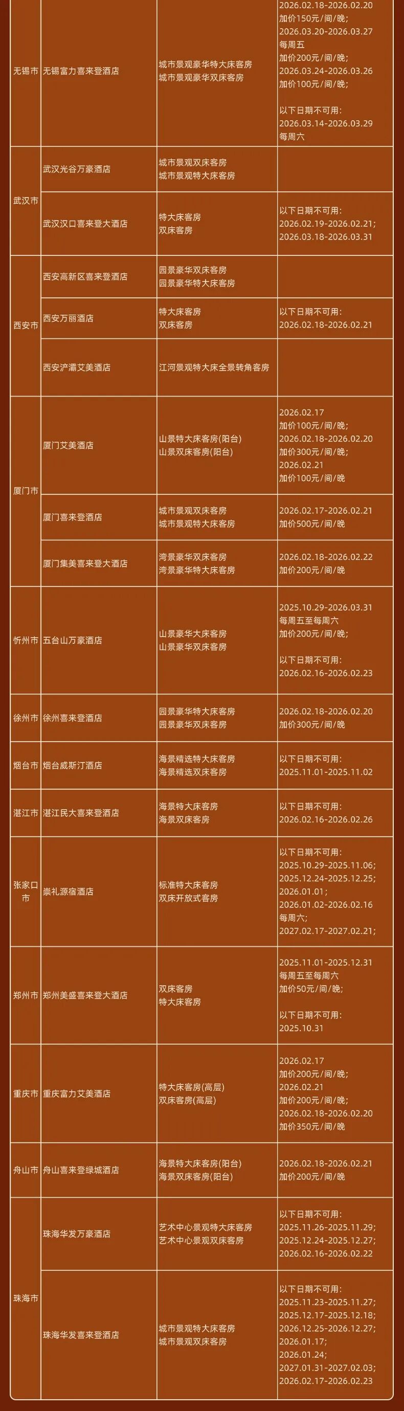 神州半岛福朋喜来登、九寨沟德尔塔(春节)、安顺黄果树福朋喜来登(额外2000分)、北京海淀雅乐轩(春节)、苏州太湖万豪、海口万豪、揭阳万豪、秦皇岛万豪、福州东湖万豪、开封大宏喜来登、西双版纳云投喜来登、昆明喜来登、青岛西海岸喜来登(春节)、兰州喜来登(春节)、上海嘉定喜来登(春节)、烟台金沙滩喜来登、日照喜来登、中式利和威斯汀、武汉汉阳威斯汀、洛阳万怡、三亚海棠湾万丽、重庆福朋喜来登、鹤山方圆福朋喜来登、上海普通Moxy(春节) 等