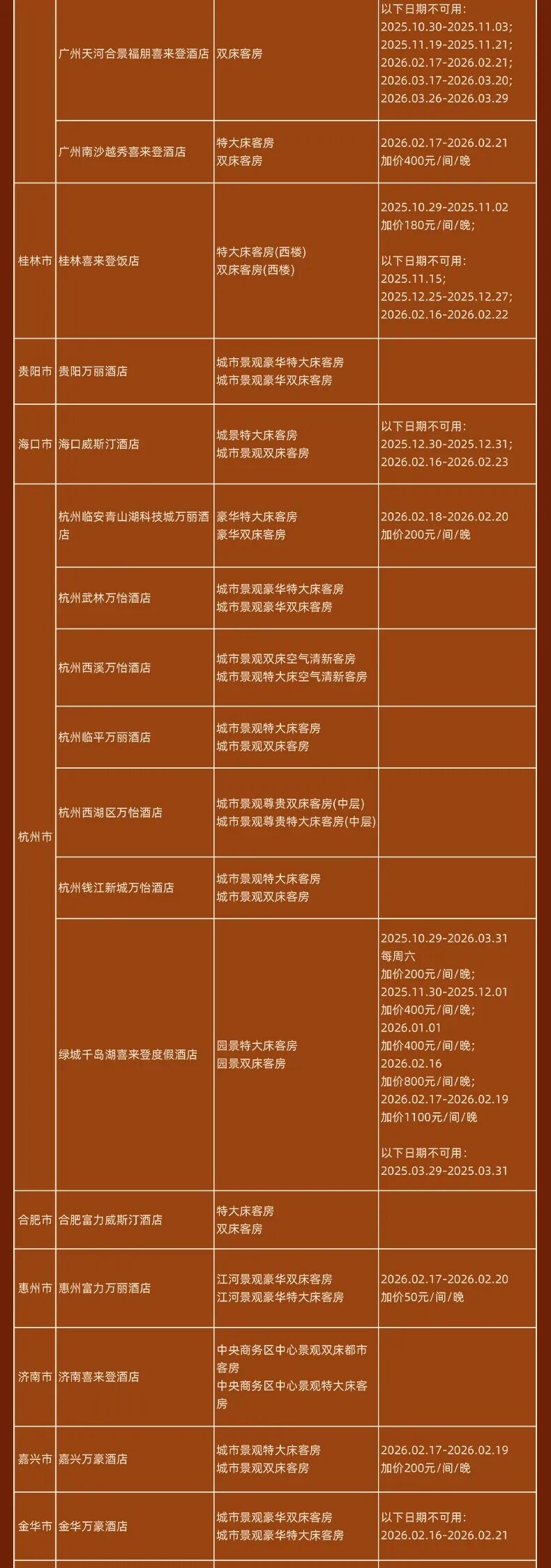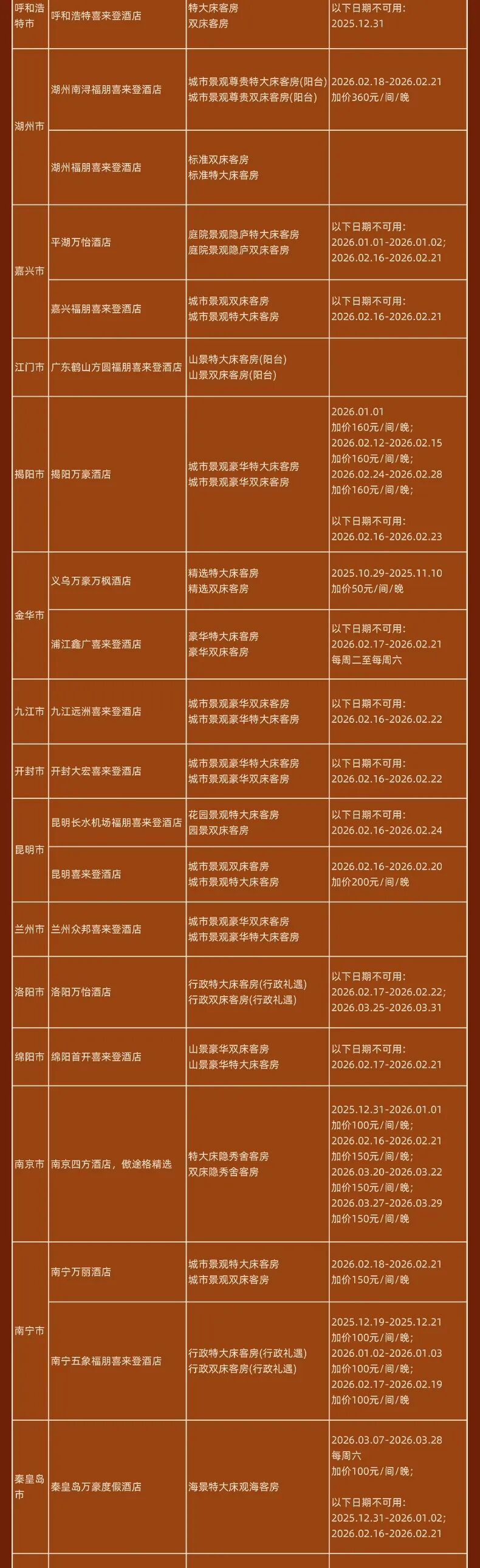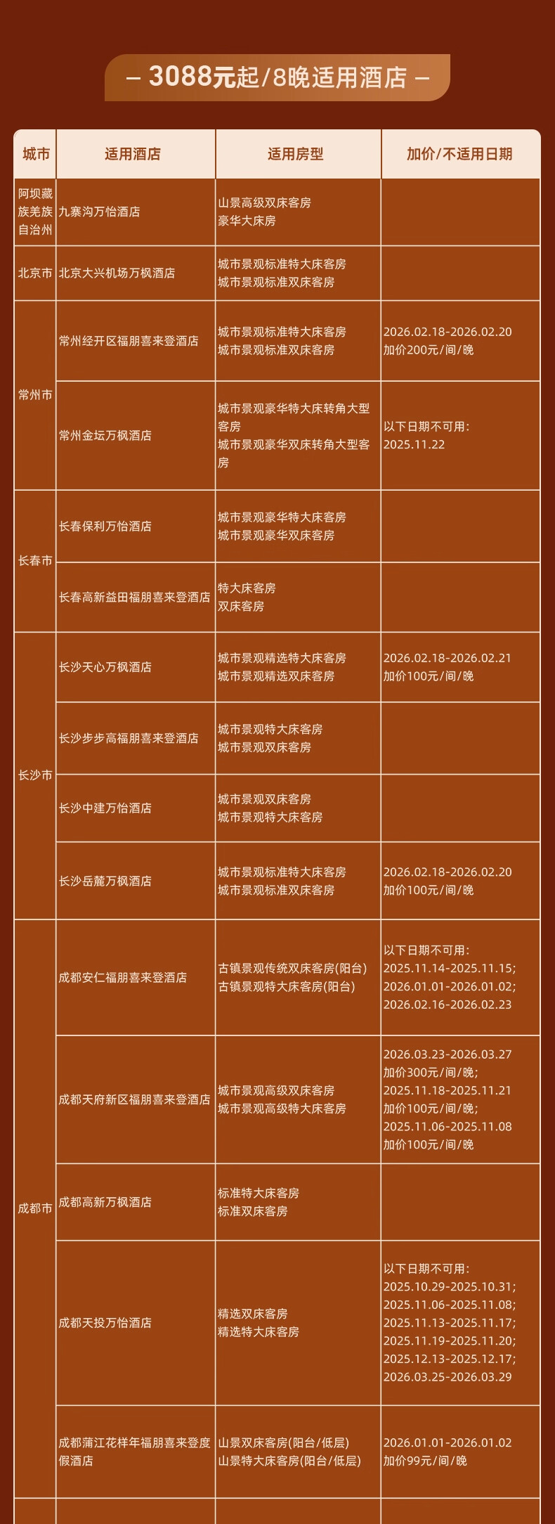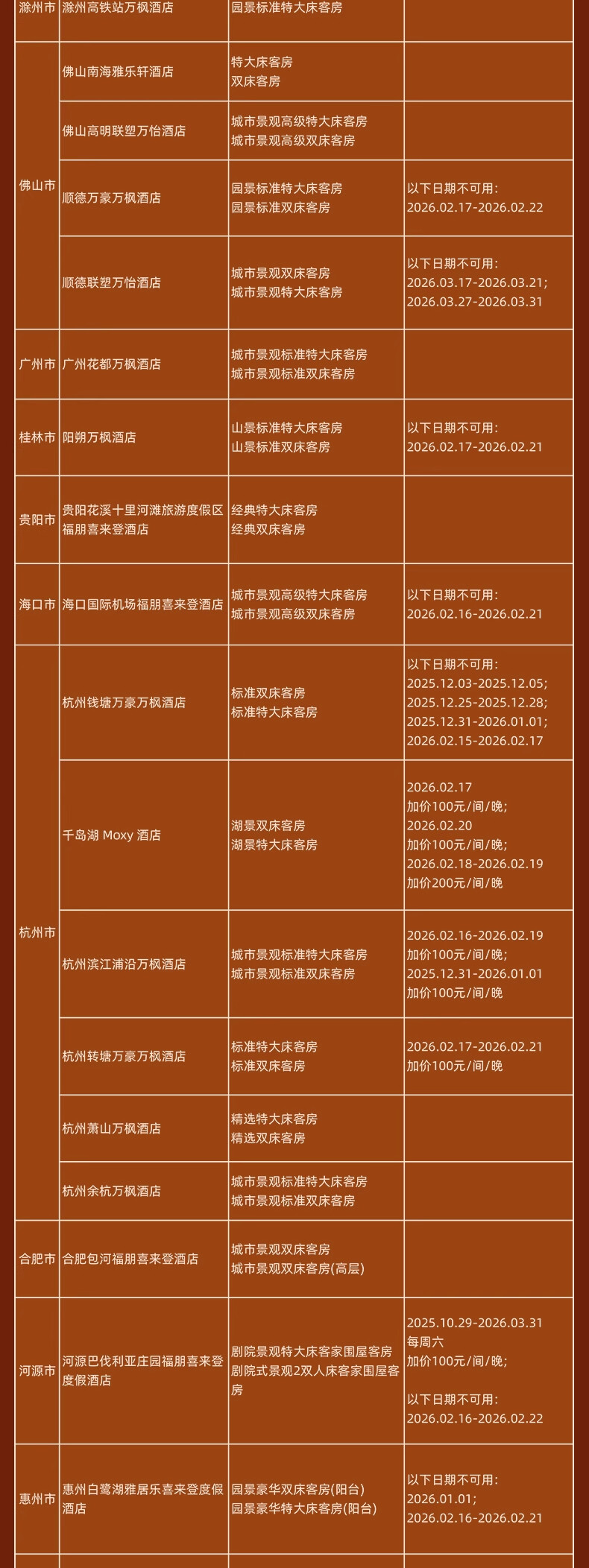 神州半岛福朋喜来登、九寨沟德尔塔(春节)、安顺黄果树福朋喜来登(额外2000分)、北京海淀雅乐轩(春节)、苏州太湖万豪、海口万豪、揭阳万豪、秦皇岛万豪、福州东湖万豪、开封大宏喜来登、西双版纳云投喜来登、昆明喜来登、青岛西海岸喜来登(春节)、兰州喜来登(春节)、上海嘉定喜来登(春节)、烟台金沙滩喜来登、日照喜来登、中式利和威斯汀、武汉汉阳威斯汀、洛阳万怡、三亚海棠湾万丽、重庆福朋喜来登、鹤山方圆福朋喜来登、上海普通Moxy(春节) 等