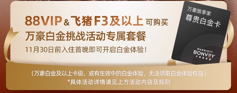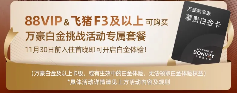 万豪自己也说了,专为白金挑战量身打造的全新套餐,震撼上线。只要你是88VIP或飞猪F3以上,不限万豪新老用户,都可以购买并参与挑战。