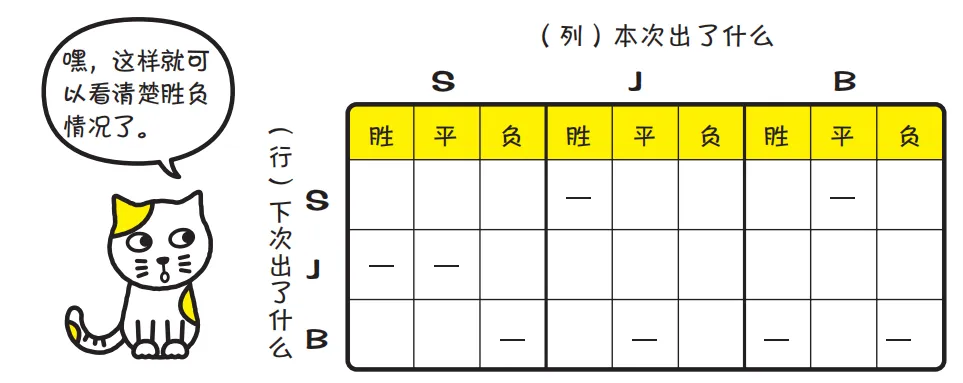 做一张 3 行 × 3 列的表格,在每一列标上 S、J、B,表示“本次出了什么”,然后在每一行也标上 S、J、B,表示“下次出了什么”。