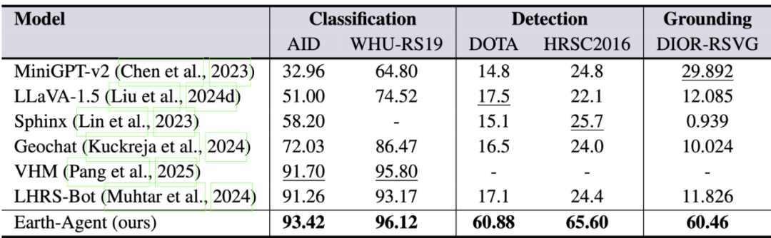 研究者还将 Earth-Agent 和通用的 Agent 架构以及 MLLM 方法进行了横向对比,可以发现 Earth-Agent 在各个 Spectrum、Products、RGB 三个模态的效果领先于通用的 Agent 架构,并且在经典的遥感分类、检测、分割任务中相比于 MLLM 都取得了领先的性能,这验证了 Earth-Agent 在地球观测任务的巨大应用前景。