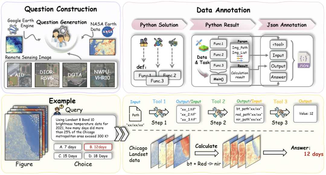 举一个例子:「利用 2022 年纽约市 Landsat 8 热成像和反射率数据,采用单通道方法基于 NDVI 和热波段 10 估算 LST,然后计算夏季和秋季的平均 LST,并确定平均差以评估这两个时期之间的季节性温度差值。A. 8.65K B. 10.89K C.12.42K D.14.75K。」可以看到,Earth-Bench 的题目不再局限于对于原始地球观测数据进行简单的一步即可完成的描述、分类、计数任务,而是强调利用地球科学的知识进行严格的指标计算和时空分析。