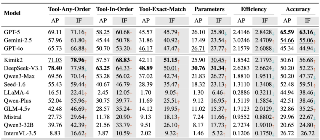 通过对 GPT、Gemini、Kimik2、DeepSeek、Qwen 等主流模型的测试,评测结果揭示了进行工具调用(Tool Calling)预训练的语言模型表现大幅领先于没有进行工具调用预训练的模型。闭源模型最终准确率更高,但 DeepSeek-V3.1 和 Kimik2 在推理过程中工具使用的准确率上超越 GPT-5。