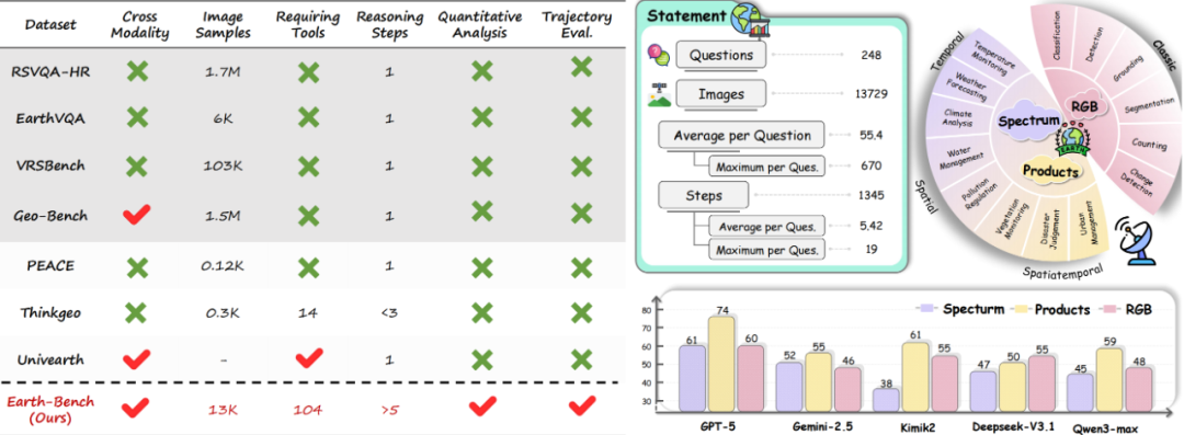 Earth-Bench 包含 248 个专家标注的任务,涵盖 13,729 张图像,分布于三大模态: