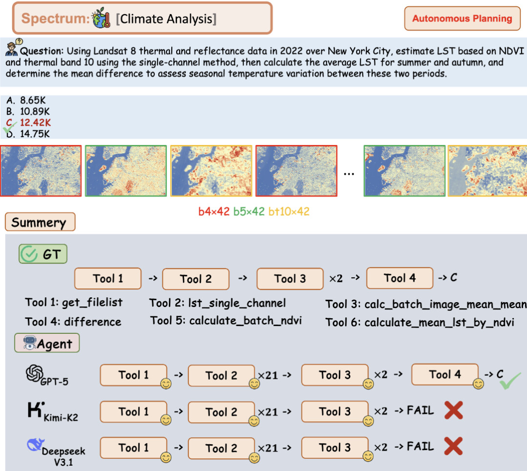 而今,这些 「致命伤」 终于迎来了它们的解药。想象一下,有一个能真正理解并执行复杂地球科学任务的 「AI 科学家」。它能够理解你的研究意图,像人类专家一样自主规划分析流程;可以处理原始光谱数据、遥感影像和地球产品,进行专业的指数计算和参数反演;能在多步骤推理中调用最合适的工具,完成从数据预处理到时空分析的全流程工作。