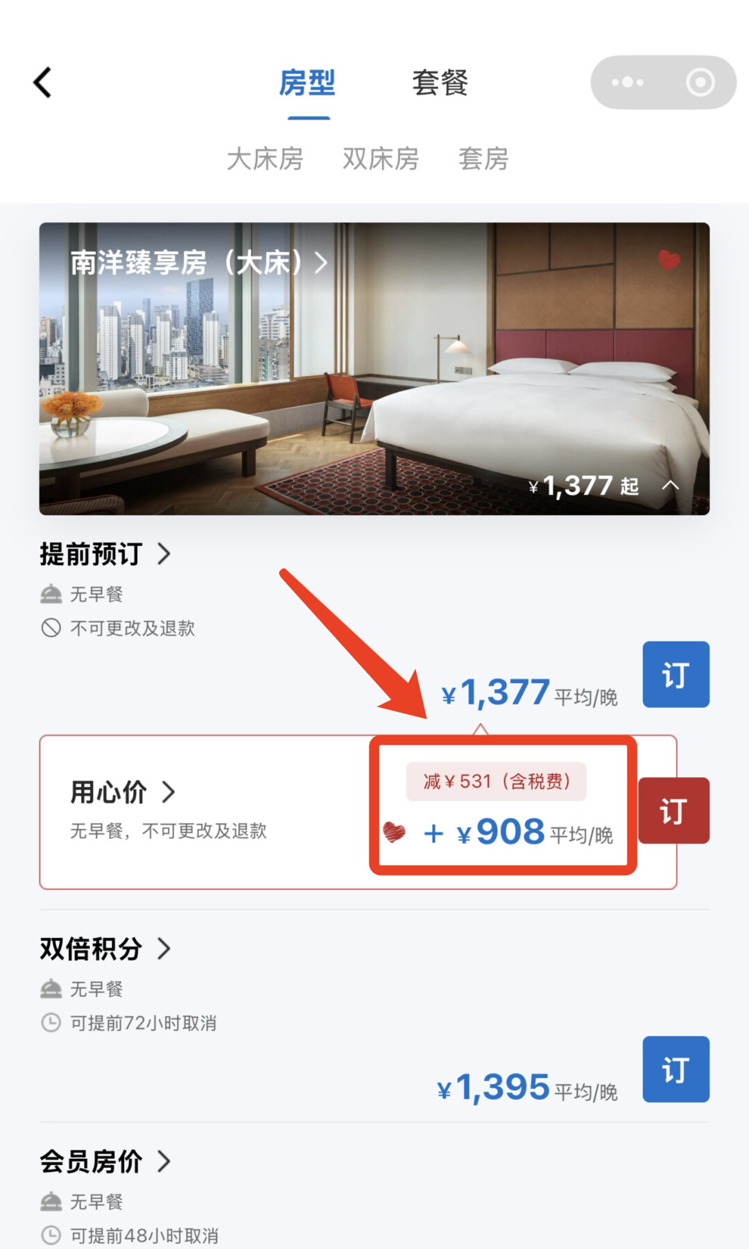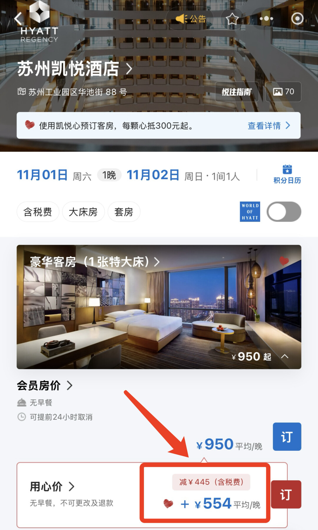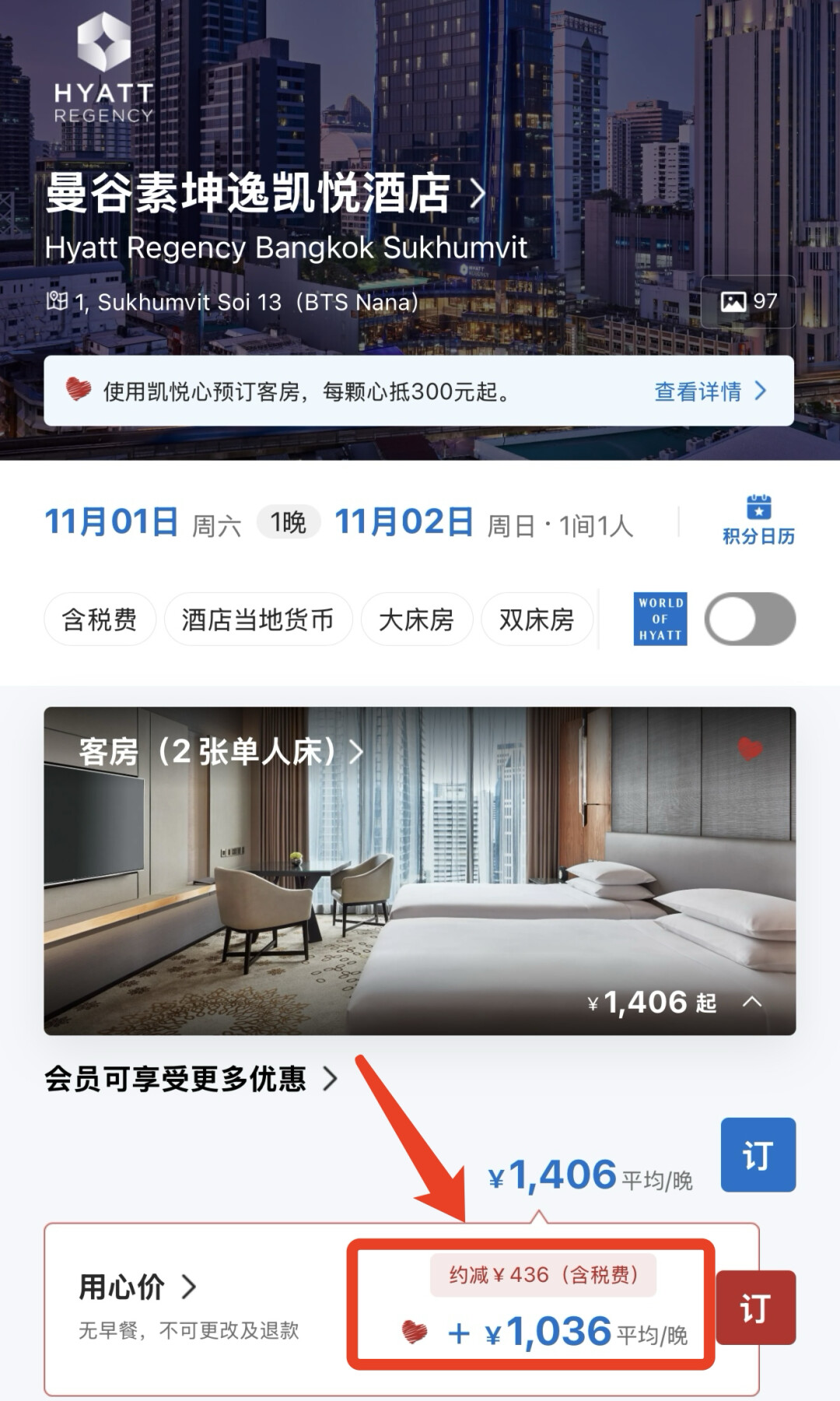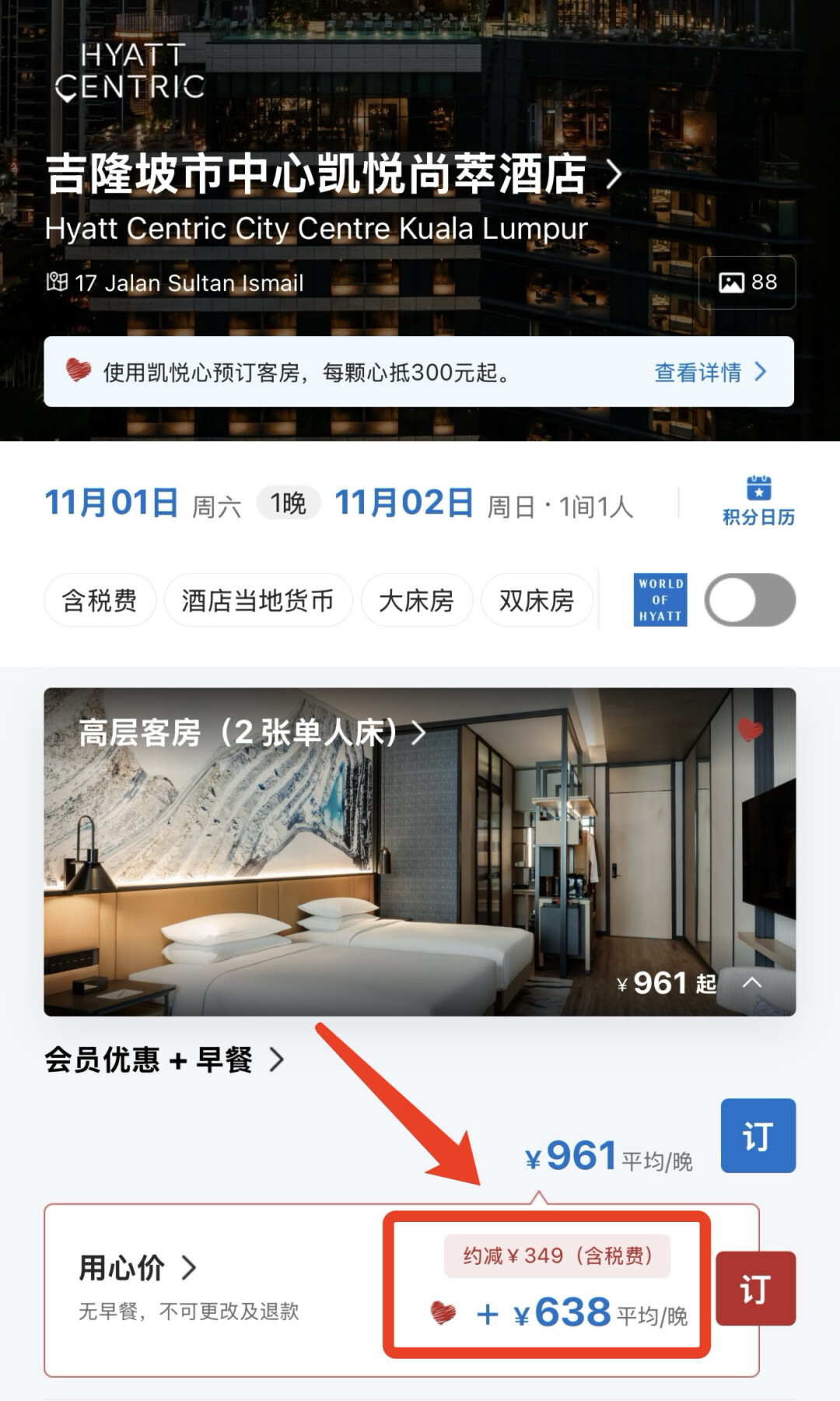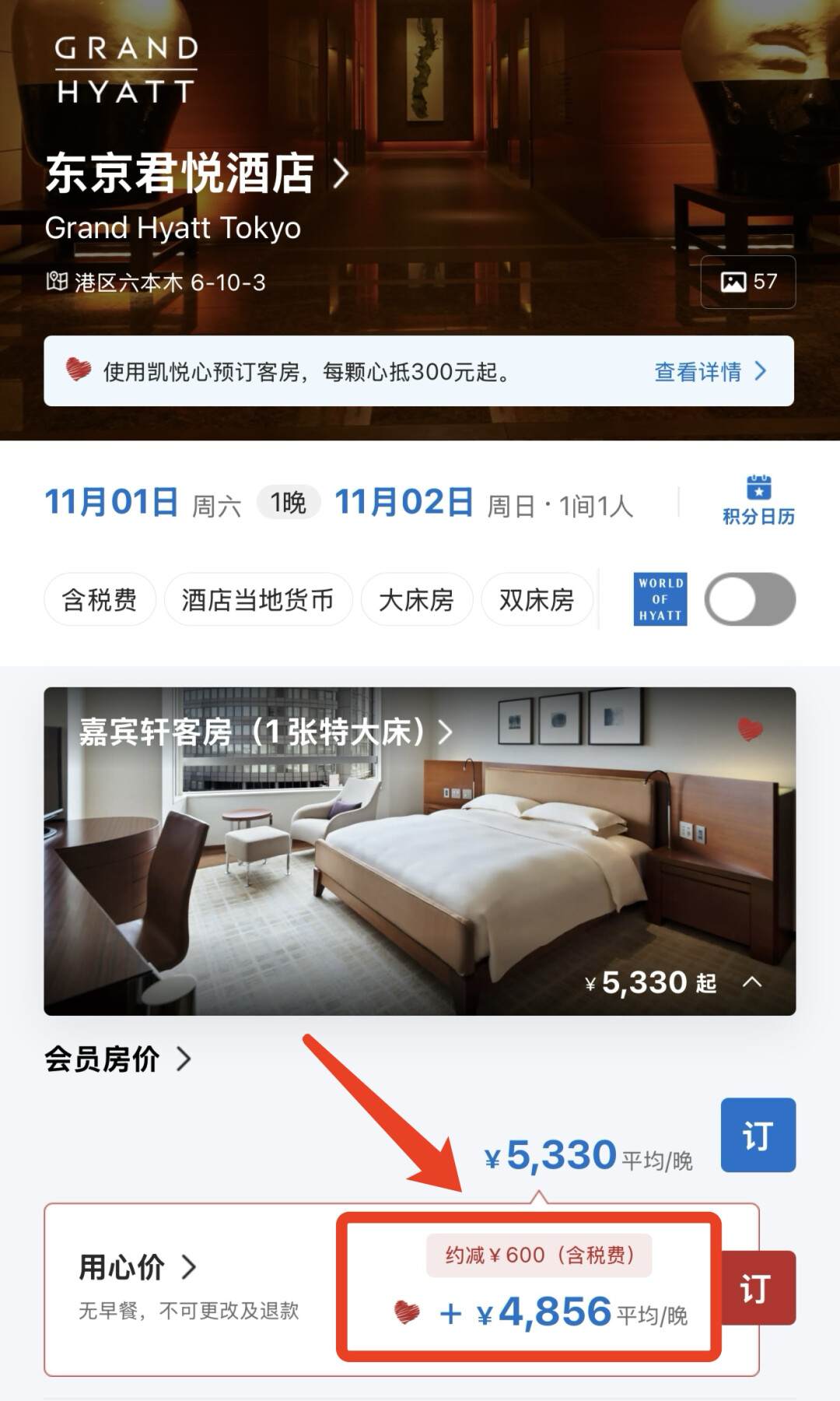 每间房可使用一颗凯悦心,可在最优房价上再优惠至少300元,部分高房型抵600元,海外高房型有些能抵到800元!