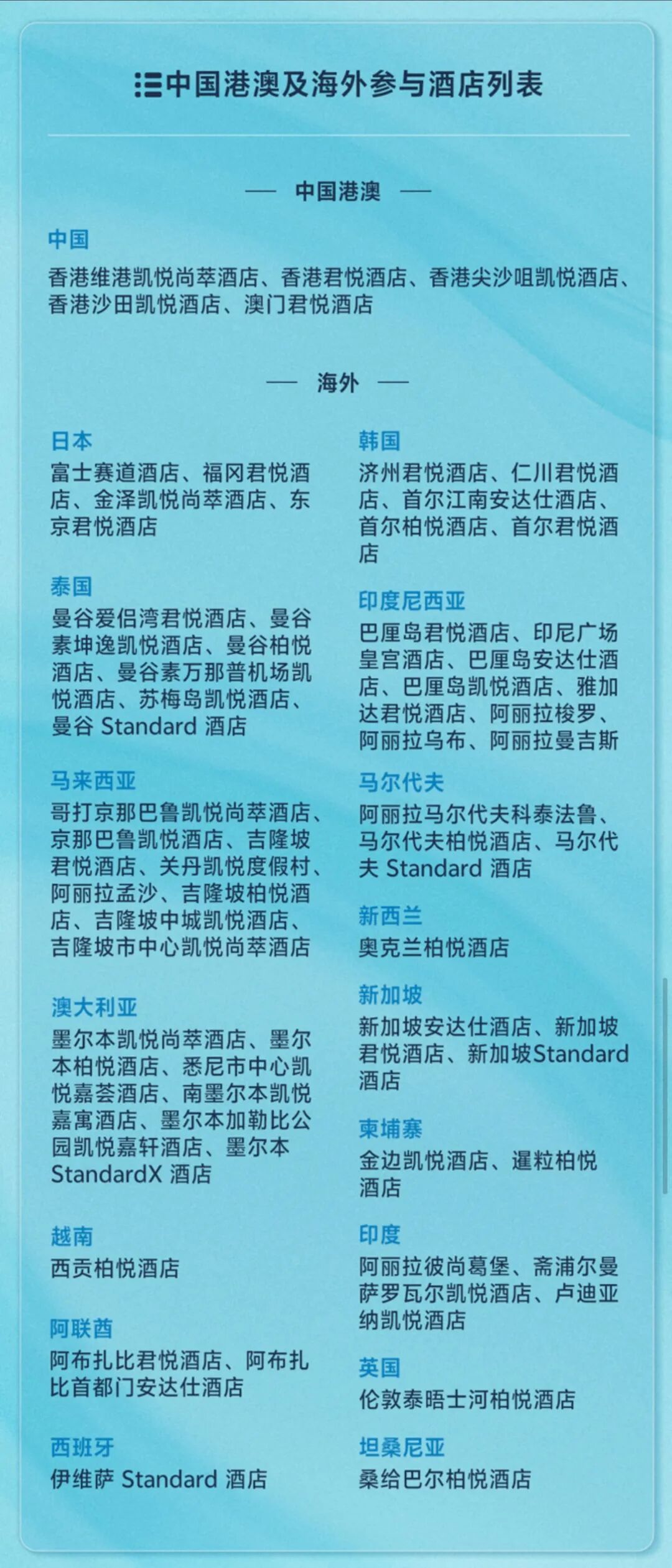 凯悦心适用于17个国家170+酒店,覆盖中国内地、中国港澳、还有日韩、东南亚、澳洲、英国等多地。
