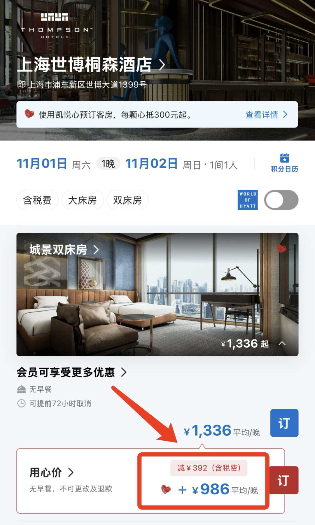 比如预订1晚上海世博桐森酒店,一颗凯悦心可以抵扣392元,仅需支付986元即可入住。