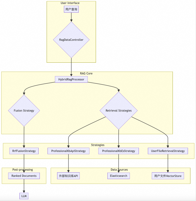 **HybridRagProcessor**):这是RAG流程的“大脑”,负责协调整个检索和融合过程。它接收查询请求,然后调用注册的各种检索策略。
