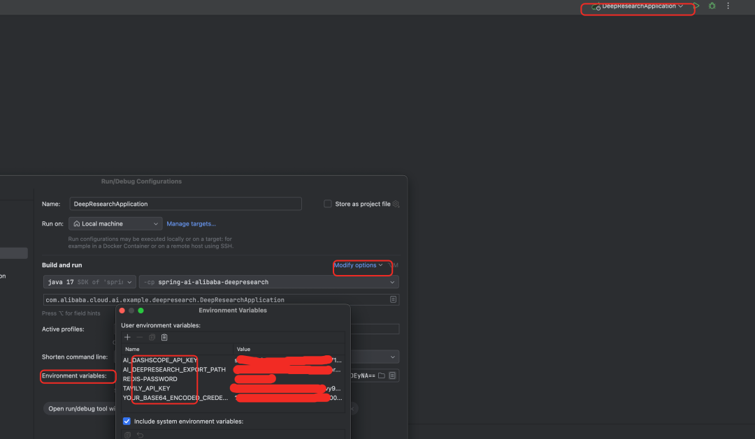 Edit Configurations -> 选择 DeepResearch 项目 -> Modify options -> Environment variables -> 配置具体的环境变量
