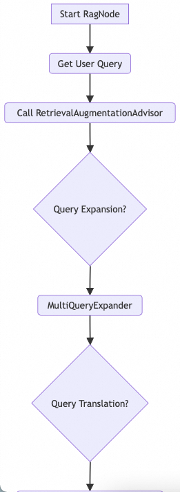 RagProperties的配置,MultiQueryExpander(查询扩展)、TranslationQueryTransformer(查询翻译)和DocumentSelectFirstProcess(后处理) 等组件被选择性地添加到 RAG 管道中。