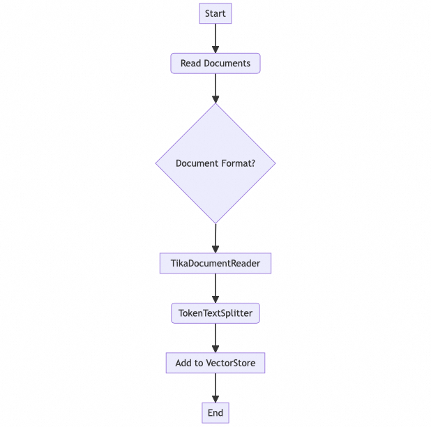 VectorStoreDataIngestionService服务负责处理实际的文档摄取工作。它使用 TikaDocumentReader 来读取多种格式的文档(如 PDF, DOCX, MD),然后利用 TokenTextSplitter 将文档分割成小块,最后将这些文档块添加到配置好的 VectorStore 中。